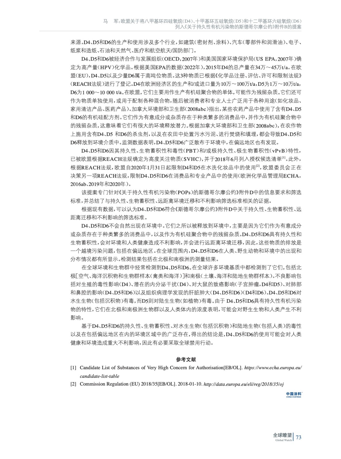 摘要:環硅氧烷D4、D5和D6化合物主要用作生產有機硅聚合物的單體,因其持久性、生物蓄積性和毒性(PBT)的特點,已被歐盟根據REACH法規確定為高度關注物質(SVHC),并于2018年6月列入授權候選清單[https://www.echa.europa.eu/candidate-list-table]。根據《關于持久性有機污染物(POPs)的斯德哥爾摩公約》附件D中的信息要求和篩選標準,歐盟已經開啟了增列D4、D5和D6化合物為POPs物質管控的前期準備工作。